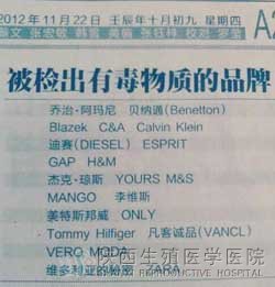 2012年4月,該組織在全球29個西安市和地區購買141件服裝樣品,種類包含男裝、女裝、童裝,款式包括牛仔、褲子、T恤、連衣裙和內衣等。檢測結果顯示,這些樣品中,有89件被檢測出NPE,占到總樣品數的三分之二,并幾乎涉及全部品牌。除含有NPE與鄰苯二甲酸酯外,ZARA與李維斯這兩個品牌中的兩款服裝又被驗出含有加重病情物質“芳香胺”。31件帶有膠印圖案的樣品中有4件樣品被檢測出高濃度的環境激素鄰苯二甲 酸酯。另外大多數樣品上都被檢測出多種不同種類的具有潛在危害的工業化學品。