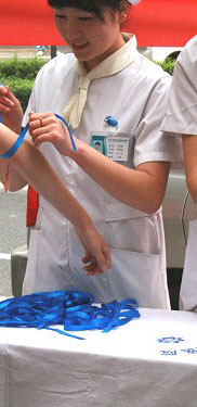 系上藍(lán)絲帶,我們和災(zāi)區(qū)人民在一起